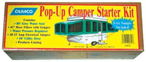 Camco Mfg RV Pop-Up Camper Starter Kit provides the new RVer with just the right products to get started in the camping life. Experienced RVers upgrading to bigger units can drive away with new items to enhance their purchase. This kit includes a 10 feet drinking water hose, water pressure regulator, grey water seal and 45 degree hose elbow.